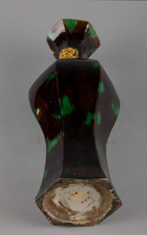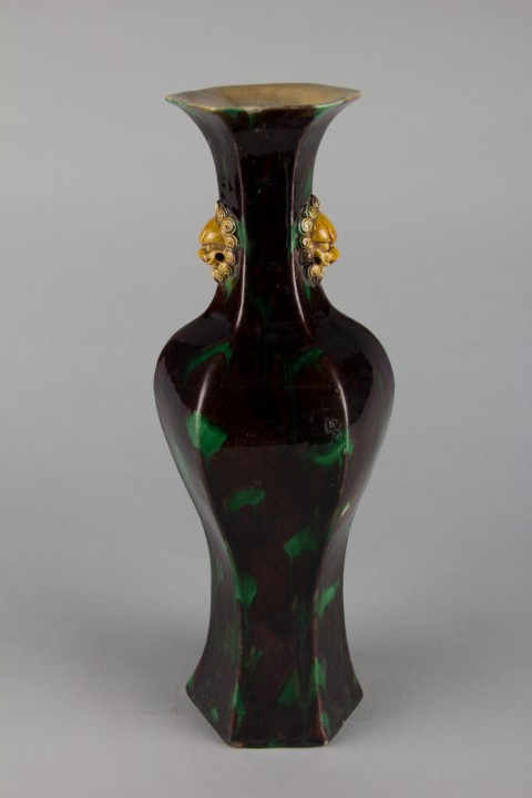 此瓶为景德镇窑产品,以彩釉素胎瓷胎为材质,高 31.8 厘米,器型呈六角形,两侧装饰狮耳(狮头柄)。彩釉工艺赋予器身丰富色泽,狮耳造型生动立体,六角形器型规整对称,既具备陈设装饰功能,又因独特的造型设计与彩釉技术展现出鲜明的艺术风格,体现了明代晚期景德镇窑在陶瓷造型创新与彩釉工艺应用上的精湛水准。