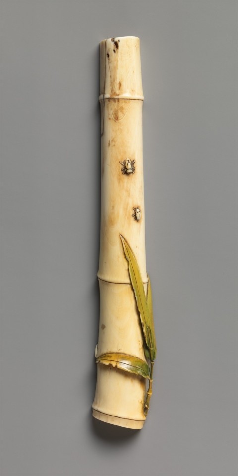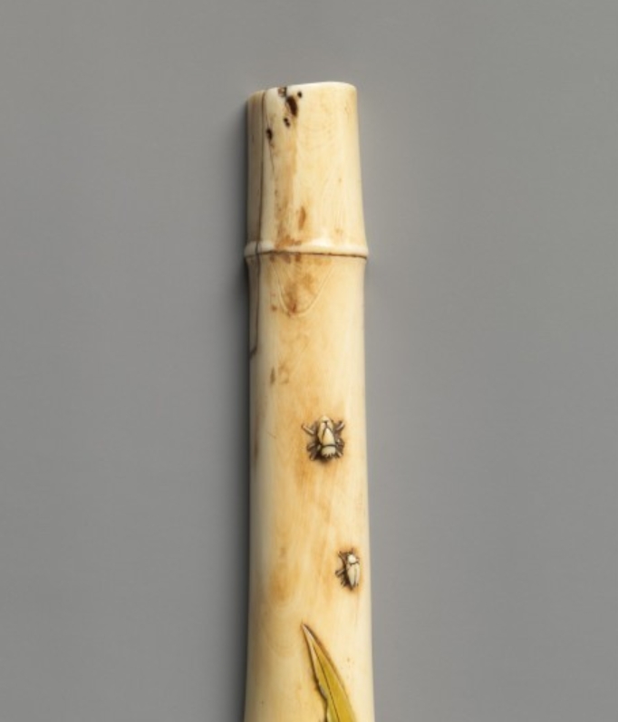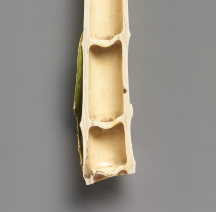 清代象牙雕刻工艺达到较高水平,常以自然中的动植物为创作题材,通过细腻的雕刻技法赋予作品生机与灵动感。竹节象征坚韧高洁,飞虫则增添自然意趣,此类题材反映了当时社会对自然的观察与艺术化表达,为研究清代象牙雕刻的题材多样性与工艺特点提供了实物依据。