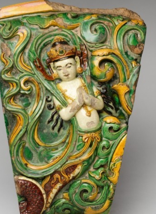 此飞天砖以彩釉陶器为材质,高 54 厘米,宽 33 厘米,深 17.1 厘米,属 “瓷塔” 的建筑构件。采用三彩琉璃工艺,饰有飞天图案,既具备建筑装饰功能,又因精美的釉色与题材设计展现出独特的艺术价值,体现了永乐时期琉璃工艺在建筑装饰上的精湛水准。
