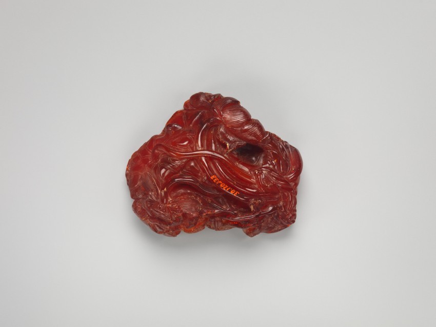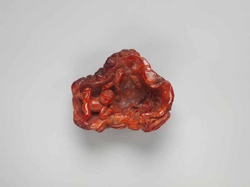 此器物以琥珀色蜜蜡为材质,高 8.9 厘米,宽 6.4 厘米,雕刻 “小孩追鱼”(推测为鲤鱼)的婴戏题材。蜜蜡质地温润,雕刻工艺细致,既可能作为实用器皿(洗),也可能作为展示品,其题材除趣味性外,还蕴含美好祝愿,体现了清代 18 至 19 世纪蜜蜡雕刻在题材选择与工艺表现上的特色。