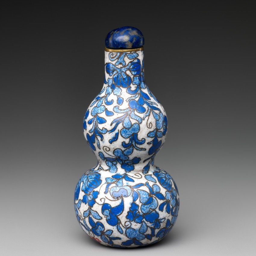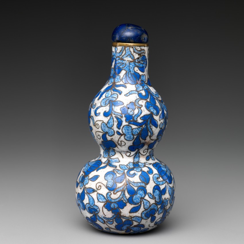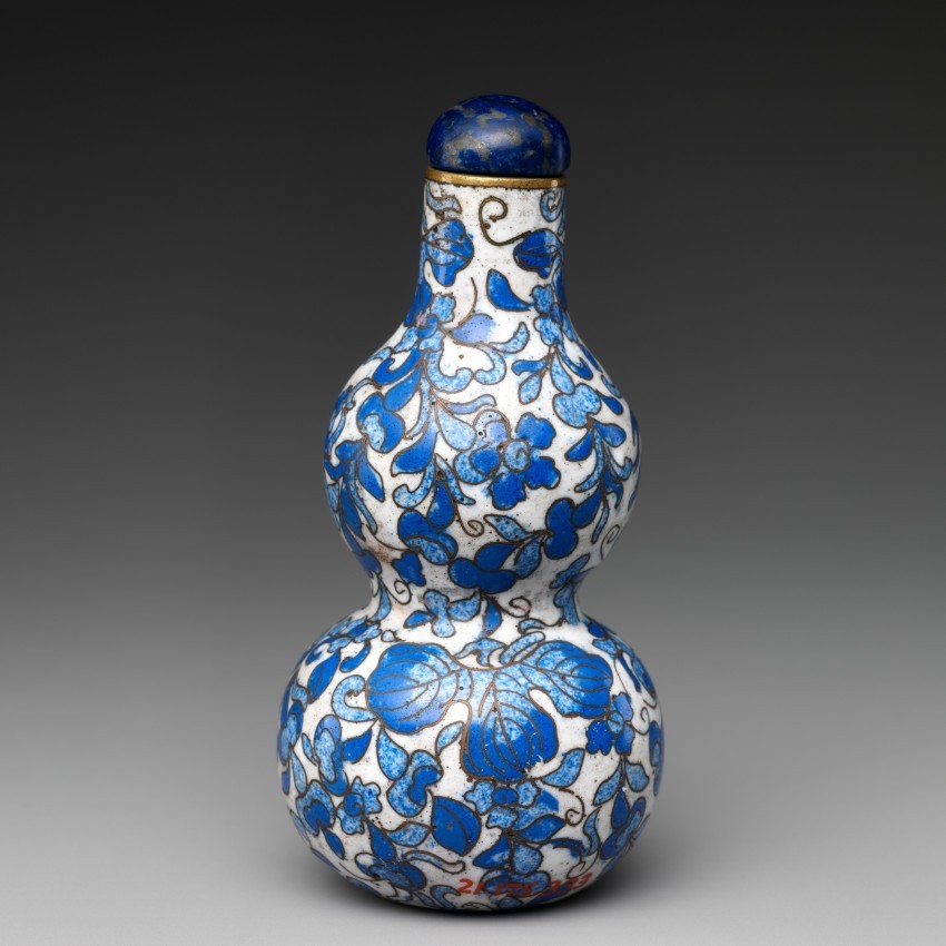此鼻烟壶以彩绘珐琅为主要材质,搭配青金石瓶塞,高 8.3 厘米,造型为葫芦形。铜胎掐丝珐琅工艺精致,葫芦造型象征子孙繁衍(因藤蔓多果的特性寓意家族多子多孙),既具备盛放鼻烟的实用功能,又因珐琅的艳丽色泽与吉祥造型展现出独特的艺术价值,体现了乾隆时期鼻烟壶在工艺与寓意表达上的融合。