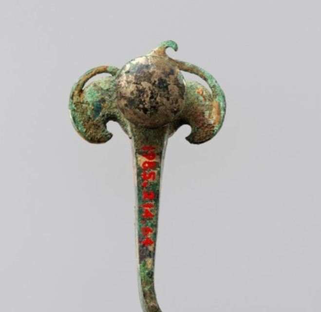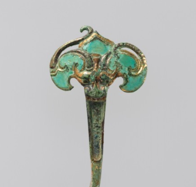战国至西汉时期,金属工艺(尤其是鎏金与镶嵌技术)趋于成熟,带钩作为贵族与士大夫的重要服饰配饰,不仅是实用器物,更是身份地位的象征。此带钩的鎏金与松石镶嵌工艺,反映了当时对金属表面处理与宝石装饰的高度掌握,其造型与工艺为研究战国至西汉时期的服饰文化、金属工艺发展及社会等级制度提供了实物依据。