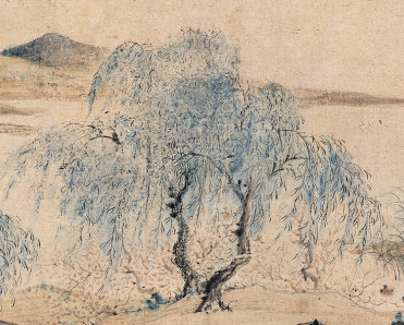 本品纵 24.2cm 宽 106.1cm。是清代恽寿平(或其传派)的《花坞夕阳图》 ,属山水长卷。画面以淡墨浅彩绘就,山峦起伏,用披麻皴等技法展现纹理,近景柳树枝干摇曳、枝叶含情,水面开阔,营造出宁静悠远氛围。题字与钤印增添文人气息,体现清代文人画注重意境、诗书画印融合的特点,借山水传递闲适心境与审美追求,是研究清代山水画及恽派艺术的重要作品 。