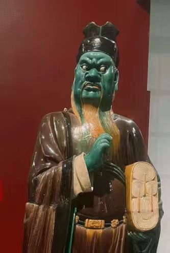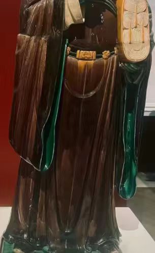 这尊为罚恶司,整体塑造极为生动,怒目圆睁,凶神恶煞,令人不寒而栗。脸部施以绿釉,胡须呈暗黄色,穿着世俗中的官服,手持地狱生死簿。这尊明代山西三彩釉陶判官像,造型生动,气势威严。判官头戴黑色官帽,面部表情狰狞,肤色呈青绿色,浓眉倒竖,双目圆睁,大鼻阔口,络腮胡须和长长的髯须自然下垂,尽显威严与冷峻。身着深棕色长袍,袍服质感厚重,衣褶刻画细腻流畅,生动地表现出织物的垂坠感。腰间束有装饰精美的玉带,彰显身份。右手抬起,似乎在做某种手势,左手则持有一卷展开的簿册,可能是记录世人善恶的生死簿,簿册上的纹路都清晰可见,工艺极为精细。三彩釉色搭配和谐,色彩鲜明,釉面光泽温润