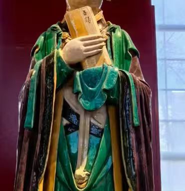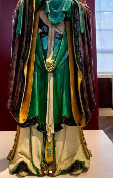 此尊三彩女判官像则属赏善司。身着绿袍,笑容可掬。赏善司执掌善薄,手里的卷宗记录人的善行。女判官高约1.48米。这尊明代地狱女判官像,以彩色琉璃塑造而成,像高148厘米,可能出自山西。女判官头戴精致头饰,面容神态严肃中带着庄重 。她身着色彩丰富且层次分明的长袍,衣袂飘飘,细节之处尽显明代琉璃工艺的精湛,例如衣褶线条流畅自然,富有动感。女判官双手持一细长的卷册,其上写有“善簿”二字 ,象征着她掌管记录世人善行的职责。