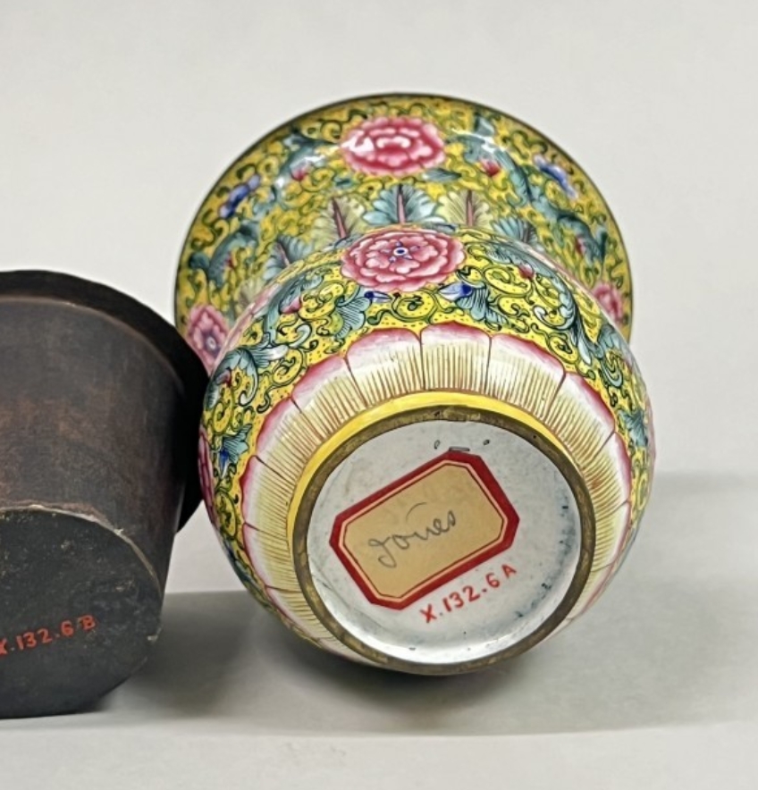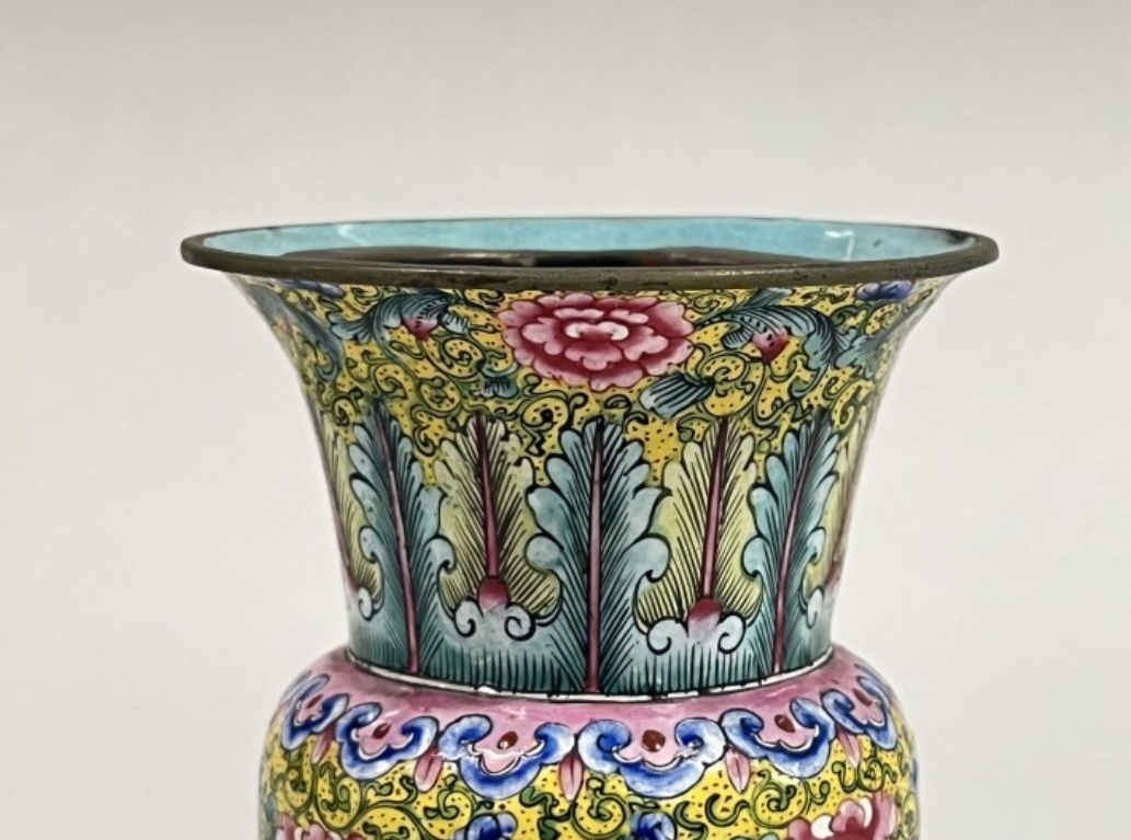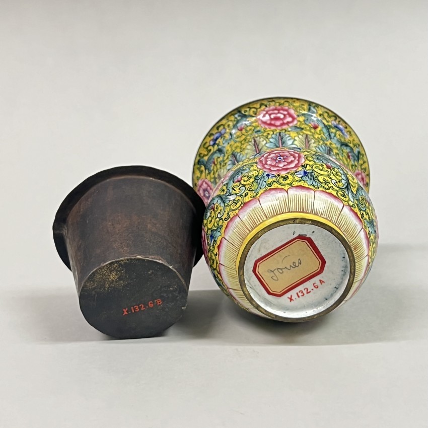 清代是铜胎画珐琅工艺的鼎盛期,宫廷与民间均有制作,工艺技法成熟。缠枝牡丹纹是明清时期流行的装饰题材,承载着对富贵吉祥的追求,广泛应用于各类器物。19 世纪虽清王朝国力渐衰,但传统手工艺仍延续精髓,此渣斗便是当时珐琅工艺的典型体现,反映了清代中后期手工业的发展脉络。