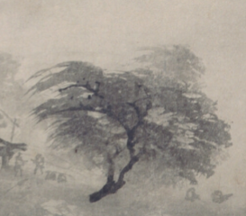 本品面积为纵32.5cm,宽112.3cm。绘平远山水,近景几株树木(或为枯树、杂木),以简率笔墨勾勒, 中景、远景是辽阔江面与朦胧山峦,江面上几点归帆若隐若现, 借大面积留白表现水天的浩渺,营造出 “虚实相生” 的空间。用 “泼墨”“破墨” 之法,墨色浓淡交融, 树木枝干、山峦轮廓以随性笔触绘出,不求形似,重 “逸笔草草” 的神韵; 归帆以极简线条点染,似融入苍茫烟霭,体现牧溪 “禅僧画” 自由洒脱、超脱形似的笔墨风格,契合禅宗 “不立文字,直指本心” 的思想。借远浦归帆、山水烟霭,营造出孤寂、空灵、悠远的禅意意境, 传递出对 “空”“寂” 的感悟,仿佛让人感受江风拂面、目送归帆的宁静, 体现宋代禅画 “以画参禅” 的追求,是研究牧溪艺术及南宋禅意山水画的核心作品, 虽画面简洁,却蕴含深邃的哲学思考与艺术感染力,尽显东方禅境美学的独特魅力。
