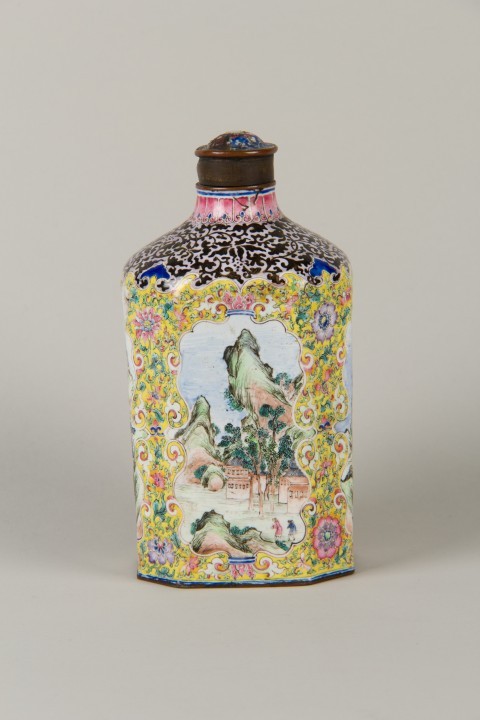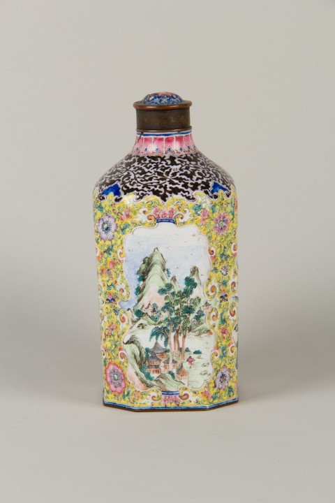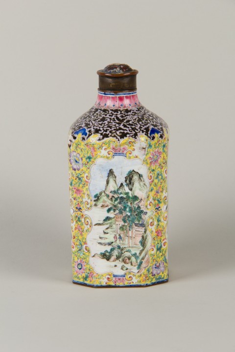 乾隆时期是清代铜胎画珐琅工艺的黄金时代,宫廷造办处技艺精湛,器物多供皇室使用,融合中西风格。开光山水图是当时流行装饰,体现文人雅士对自然山水的推崇。此瓶见证了乾隆朝手工业的鼎盛,反映了当时宫廷审美与工艺水平的高度结合。