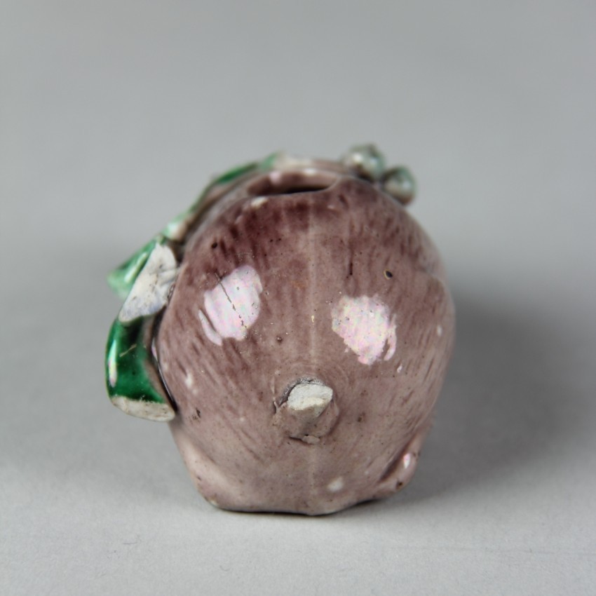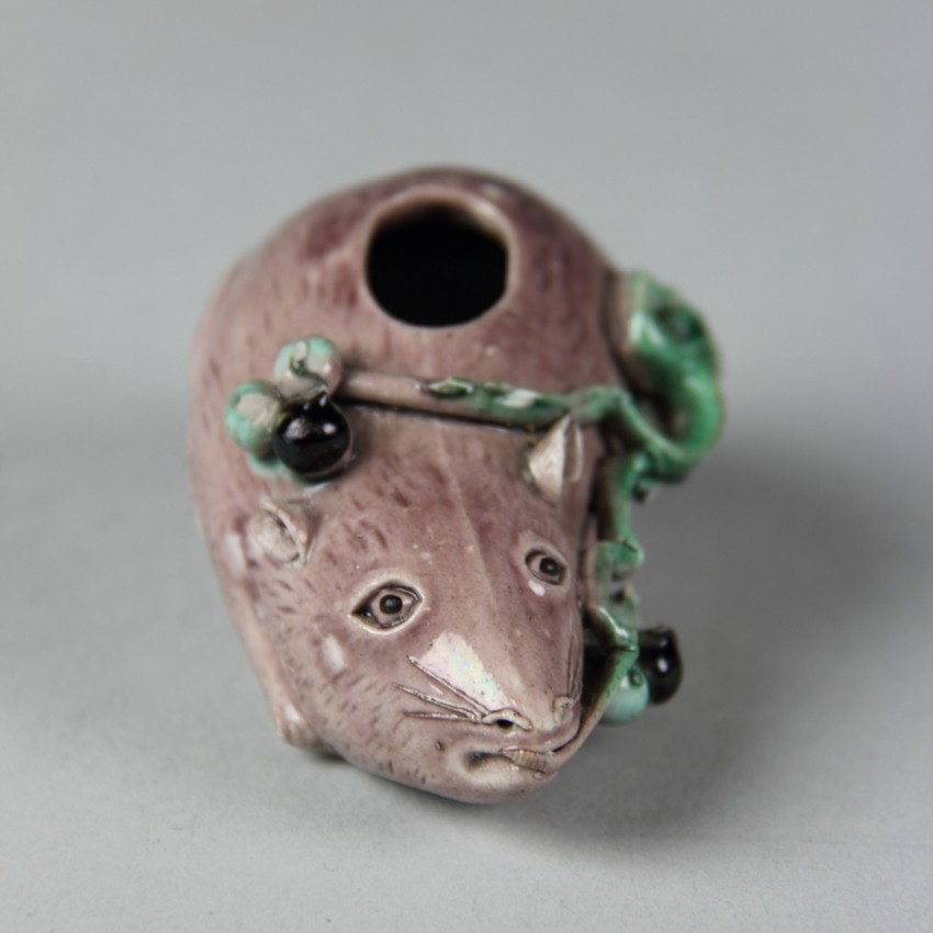 康熙时期是素三彩工艺的鼎盛阶段,以黄、绿、紫三色为主,色调素雅明快,多用于文房用具与陈设瓷。鼠形造型在传统器物中较少见,体现了工匠的巧思与生活情趣的融入。此水盛反映了康熙朝制瓷工艺的创新水准,也见证了清代文房用具追求雅致与实用结合的风尚。