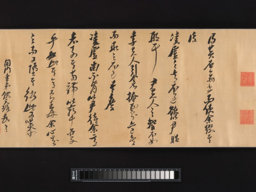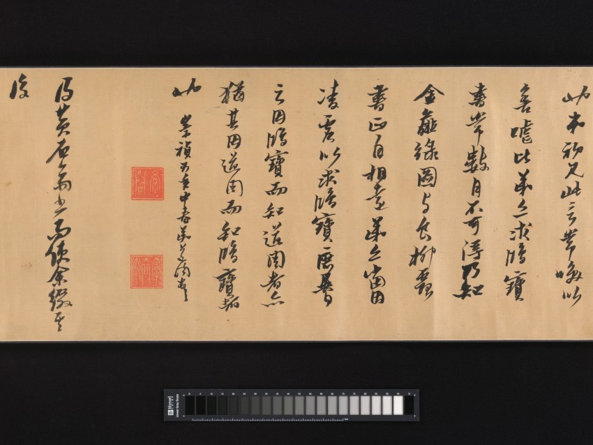 此为明代 1632 年黄道周与倪元璐的《二家法书合卷》,属手卷,以绸缎为材质,采用水墨书写。图像尺寸为 27.1×146.7 厘米,整体连裱 27.5×907.9 厘米。黄道周(1585-1646)是明末学者、书画家、民族英雄,倪元璐(1594-1644)为明末官员、书法家,二人同为 1622 年进士,均倡导政治改革。卷中黄道周以诙谐笔法谈及二人书法相互影响,倪元璐亦附回应,书法风格源于正统却带强调棱角,斜握毛笔形成 “侧尖” 笔触,现藏于美国大都会博物馆。