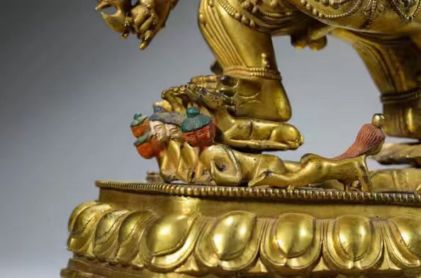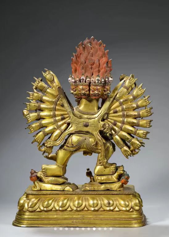 重11.8kg长26.5cm宽16.5cm高39cm。这尊大威德金刚身形饱满,胎体厚重,鎏金明亮,装饰宝石,发髻染红表明护法身份。他有九张脸三十四臂十六足。左脚伸直右腿弓曲于莲台日轮上,脚下踩踏的分别是八位天王和八成就。右脚踩踏象征着修持所带来的八种神秘能力; 左脚下也踩踏着象征着最高加持,即证果的八个方面。