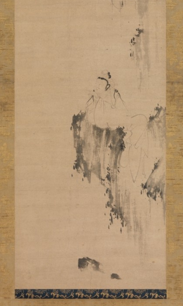 这是一幅创作于明代(约 14 世纪末)的纸本水墨立轴画。图像尺寸为 91.4×32.7 厘米,整体连裱尺寸 177.8×44.8 厘米,带旋钮整体尺寸 177.8×49.5 厘米 。画面主体是白衣观音形象,白衣观音是佛教信仰中观音菩萨常见的化身形式之一。画中的风景元素借鉴了南宋画院的细致风格,人物飘动的衣饰线条角度轮廓平坦且程式化,这种表现手法可能受到 14 世纪早期绘画风格的影响 。画面上还有高僧释宗泐的题赞,题赞内容为 “尘尘刹尘身,刹刹尘尘说。众生世界空,大士悲心歇。天界释宗泐九拜书”,并钤有 “僧宗泐印”。