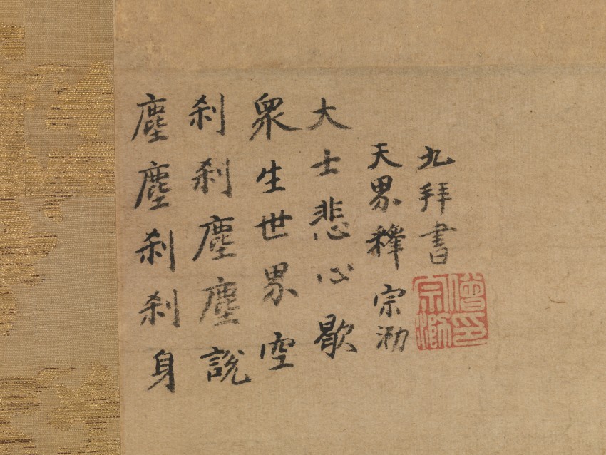 明代佛教文化较为繁荣,宗教绘画是传播教义、表达信仰的重要形式。这幅《释宗泐题赞 白衣观音图》不仅体现了当时佛教绘画的艺术水准,还反映了佛教思想在社会中的广泛传播。释宗泐作为明初佛教界的重要人物,他在画上的题赞提升了作品的文化与宗教价值,对于研究明代佛教文化、禅宗思想以及宗教绘画创作具有重要意义。