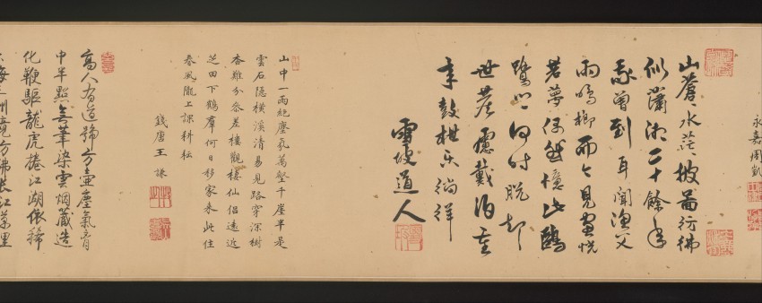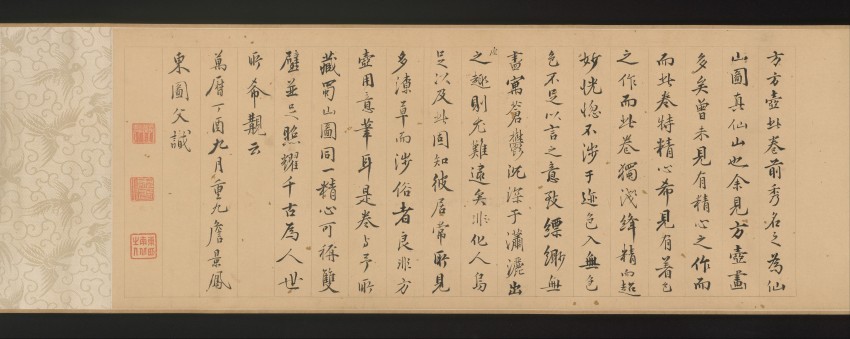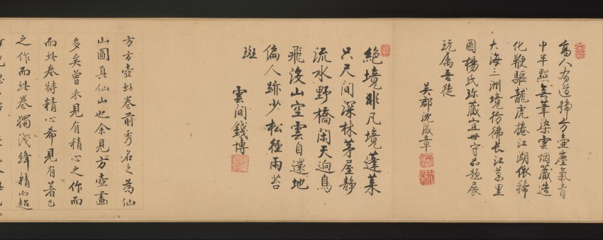 此为元代约 1360–1370 年方从义创作的《云山图》卷,属手卷,采用纸本水墨设色绘制。图像尺寸为 26.4×144.8 厘米,整体连裱 27×854.1 厘米。方从义(约 1302—1393),元末著名道士画家,江西贵溪人,字无隅,号方壶等,为龙虎山上清宫正一派道士,曾游历各地,结交文人达官,其山水画受道教神秘主义影响,风格 “化无形为有形,化有形为无形”。此卷以 “云山” 为主题,动感笔触赋予山脉超越物理结构的生动表现力,现藏于美国大都会博物馆。