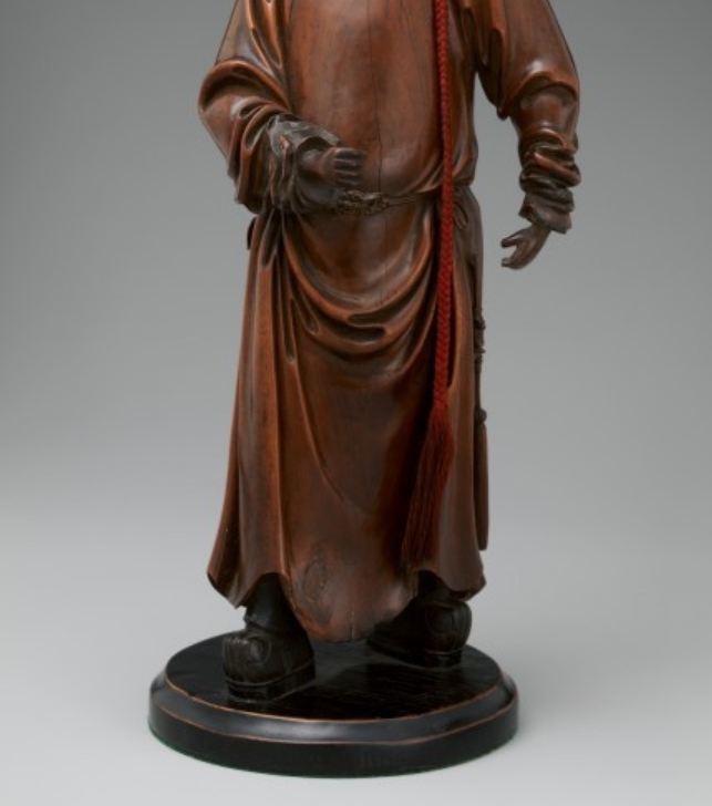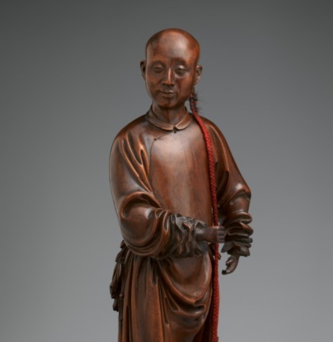 此为清代 18 至 19 世纪的黄杨木雕清代绅士像,材质包括黄杨木、马毛、丝绸,高 38.1 厘米。雕像刻画了一位梳长辫、身着满族风格低胸翻领长袍的绅士,姿态威严,面部表情自信,长袍雕刻精美且经抛光,呈现出柔软丝绸的质感,极具真实感。虽人物身份未记载,但推测为仿照真人创作,可能用于家庭纪念,现藏于美国大都会博物馆。