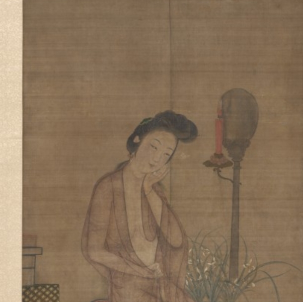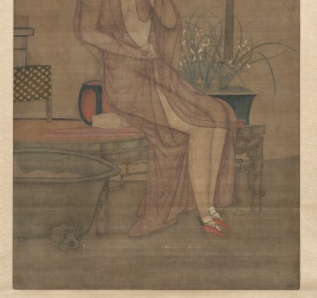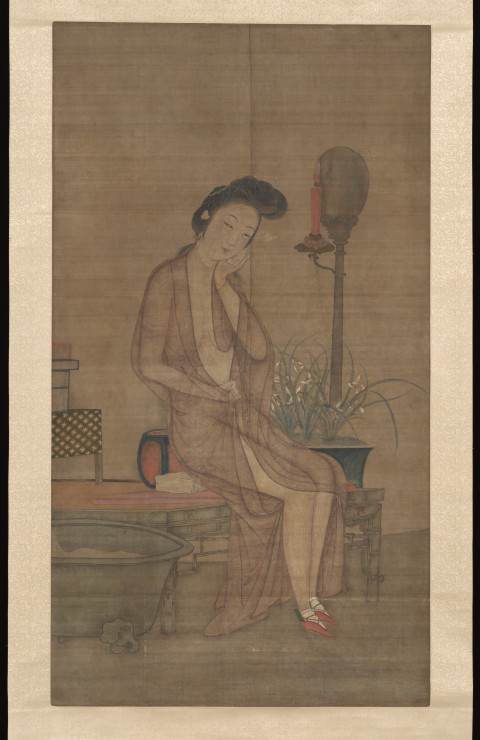 此为清代 18 世纪的佚名画作《美人出浴图》轴,属悬挂式卷轴,采用绢本水墨和色彩绘制。图像尺寸为 155.9×86.7 厘米,整体连裱 259.7×105.9 厘米,整体带旋钮 259.6×118.1 厘米。画面描绘了一位半身着透明长袍、头饰精致的女子坐于竹沙发边,背景有燃着的红蜡烛(暗示夜晚)、盛开的兰花(象征隐藏的美貌等)、书籍(表明学识)及正在放水的浴缸(似有侍者协助)。画作因女子透明长袍露体、小脚红鞋、张嘴露齿等细节,呈现出罕见的挑逗性,现藏于美国大都会博物馆。