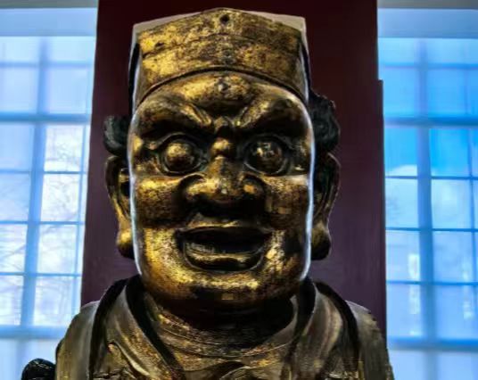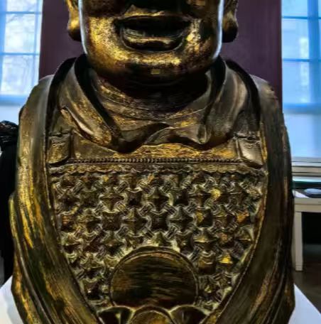面部宽颧骨、细长眼裂的特征,这是一尊铜鎏金造像,从外观来看,有古朴的色泽与纹理,表面鎏金部分因岁月呈现斑驳痕迹,展现出历史厚重感。头戴帽饰,身着服饰有雕刻纹饰,工艺较为精细