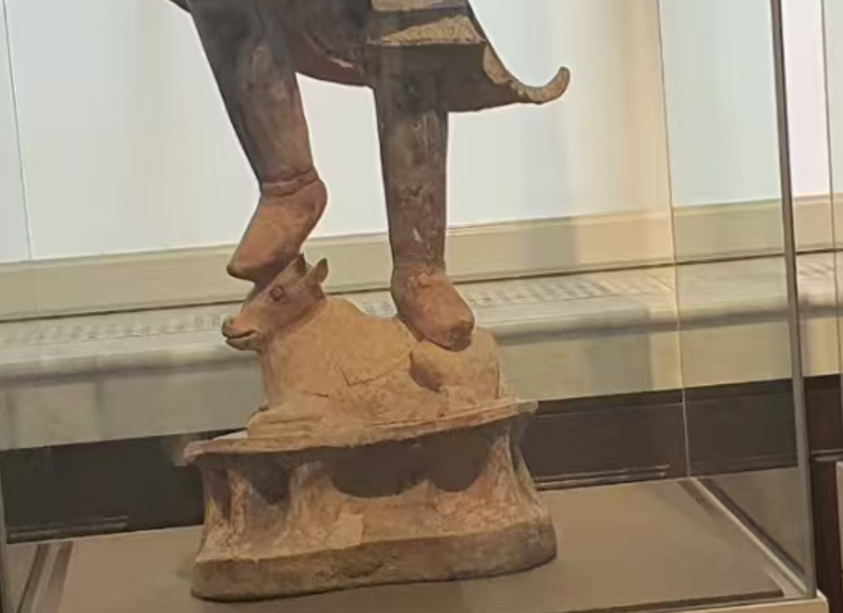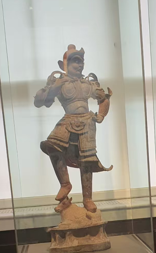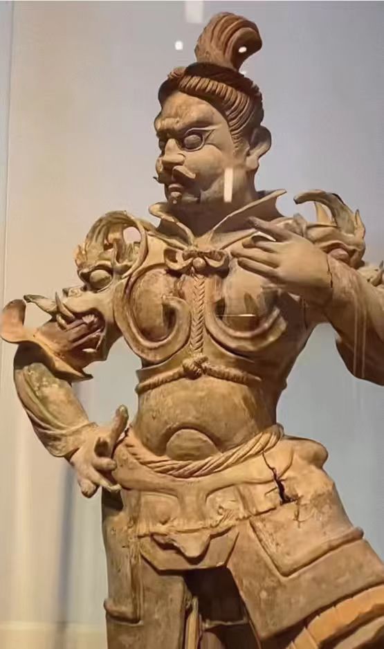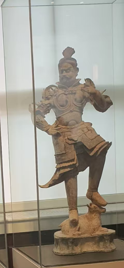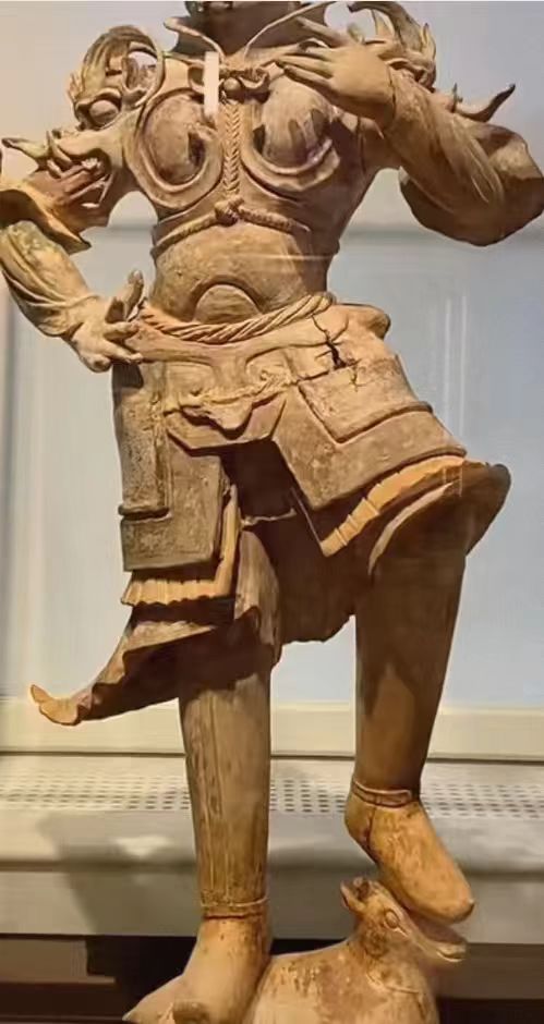 高112厘米,外表曾经镀金以及着色。- 姿态:这两尊天王俑均呈现出极具动感的姿态,单腿撑地,另一腿微抬,展现出一种蓄势待发的力量感,仿佛随时准备抵御邪祟,守护墓主安宁。