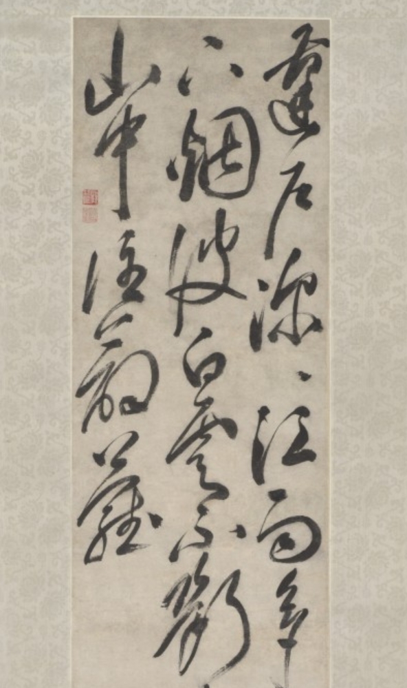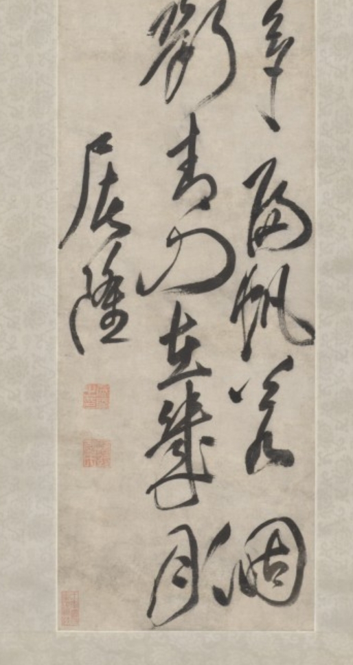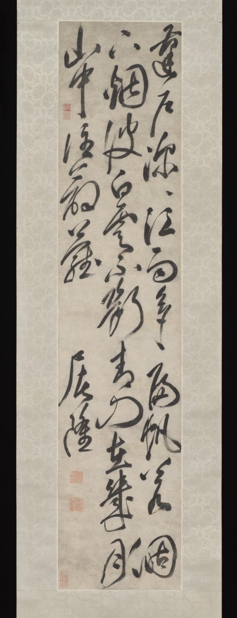 此为明代 16 世纪末屠隆创作的《草书七绝诗》轴,属立轴,采用纸本水墨书写。图像尺寸为 126.4×27.3 厘米,整体尺寸 204.5×45.7 厘米,带旋钮整体 204.5×50.2 厘米。屠隆(1542–1605),字长卿,号赤水等,浙江鄞县人,明代传奇作家、戏曲家,曾中进士任县令,后遭诬罢官,晚年卖文为生,以诗文、戏剧闻名。此作是他秋雨中与友人聚会时创作的十二首诗之一,收录于其第一本诗集,内容为 “蓬户深江雨多,扁帆若个下烟波。白云不断青山在,几月山中住薜萝”,书法偏爱粗体大字草书,字体大小不一、倾斜度大,突出弯曲和钩状笔画,受祝允明影响,钤有 “屠隆之印”“屠纬真氏” 等艺术家印章及王季迁收藏印,现藏于美国大都会博物馆。