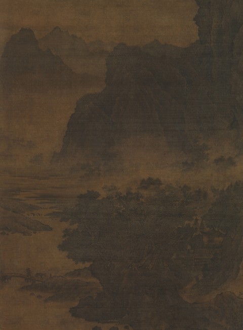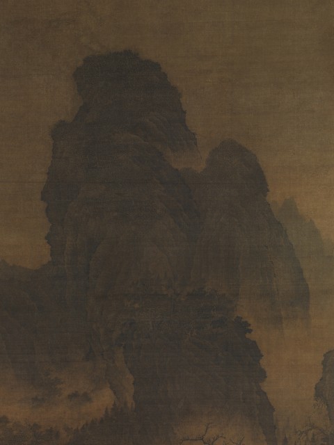 此为北宋 12 世纪初佚名创作的《仿范宽山水图》轴,属悬挂式卷轴,采用丝绸上水墨和色彩绘制。图像尺寸为 166.1×104.5 厘米,整体连裱 295.9×126.4 厘米,整体带旋钮 295.9×136.5 厘米。画作以范宽风格创作,曾被误认为明代作品,实际风格可追溯至 12 世纪,画面分三阶段:前景为船泊于树木繁茂的悬崖下,中景是前往寺庙隐居处的旅行者,背景是高耸山峰,构图中群山漂浮于薄雾中,岩石表面有 “雨滴” 纹理点,山峰多灌木,体现范宽风格典型特征,钤有项元汴 “墨林珍赏” 印,现藏于美国大都会博物馆。