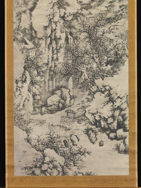 此为明代 1560 年谢时臣创作的《四时佳兴图》四幅立轴中的第二幅,属一套四卷悬挂式卷轴,采用纸本水墨色彩绘制。单幅图像尺寸约 321×94 厘米至 323.2×93.7 厘米不等,其中一幅整体连裱尺寸为 360×107.6 厘米。谢时臣(1487–约 1567),字思忠,号樗仙,江苏苏州人,能诗善画,代表作有《杜陵诗意图》等。该组画以四季山水为主题,构图相似,底部为人物、上方为高山,各季节有独立叙事:春天场景中两位骑马绅士及仆人过桥;夏天场景中旅行者在强风中挣扎,亭中绅士观风暴。此幅作为组画之一,延续了整体的诗意空间与叙事风格,现藏于美国大都会博物馆。