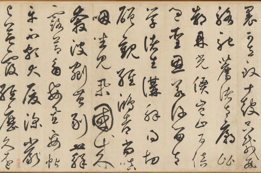 此为元代 1301 年鲜于枢创作的《草书石鼓歌》卷(第七部分),属手卷,采用纸本水墨书写。图像尺寸为 44.9×459.9 厘米,整体连裱 45.7×1186.7 厘米。鲜于枢(1246–1302),字伯机,号困学民等,渔阳(今天津蓟县)人,元代著名书法家,兼长楷、行、草书,尤以草书著称,与赵孟頫齐名,被誉为元代书坛 “巨擘”。此卷是其最著名的作品之一,内容为抄录韩愈(768-824)的《石鼓歌》(恳请保存刻有古篆诗的十个石鼓),笔法雄健,既体现北方传统的自由活力,又融入晋唐大师的造诣,现藏于美国大都会博物馆。