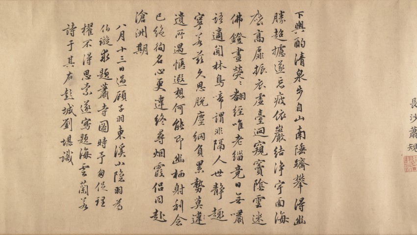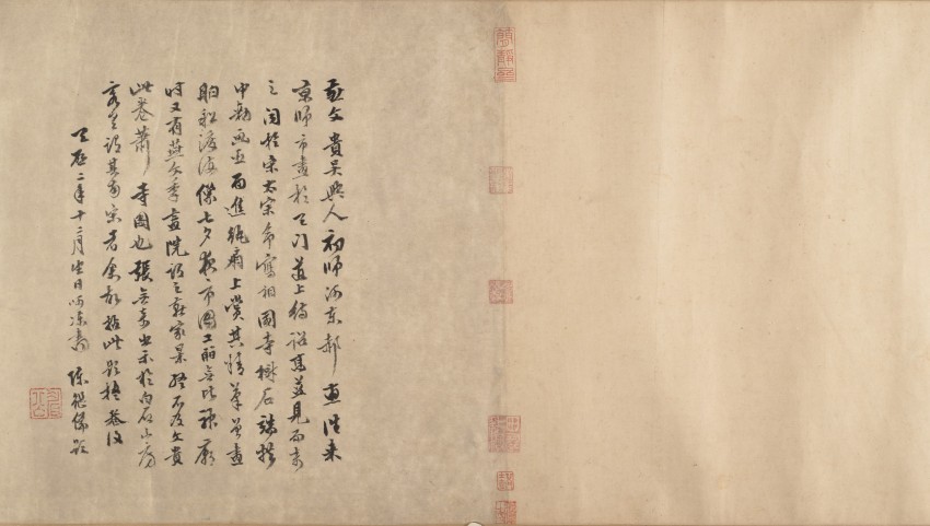 此为元至明 14 至 15 世纪佚名创作的《秋山萧寺图》卷(旧传为北宋燕文贵所作,实为仿作),属手卷,采用绢本水墨淡彩绘制,图像尺寸为 32.7×321.3 厘米,整体连裱 33.3×1133.2 厘米。画作以 “秋山佛寺” 为主题,描绘远处山隙间瀑布飞流、近处溪山层叠的景致,旅行者沿河流蜿蜒而行,沿途点缀乡村与佛教寺庙,用笔兼具轻柔(溪水、远山)与苍劲(山石),通过浓淡墨色区分层次,现藏于美国大都会博物馆。虽带有燕文贵签名,但实为后世仿作,风格与 14-15 世纪作品相符。