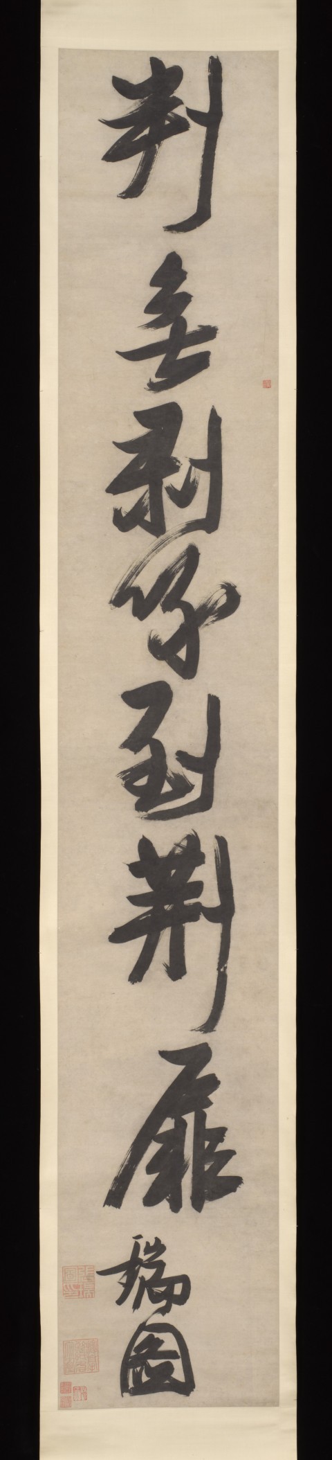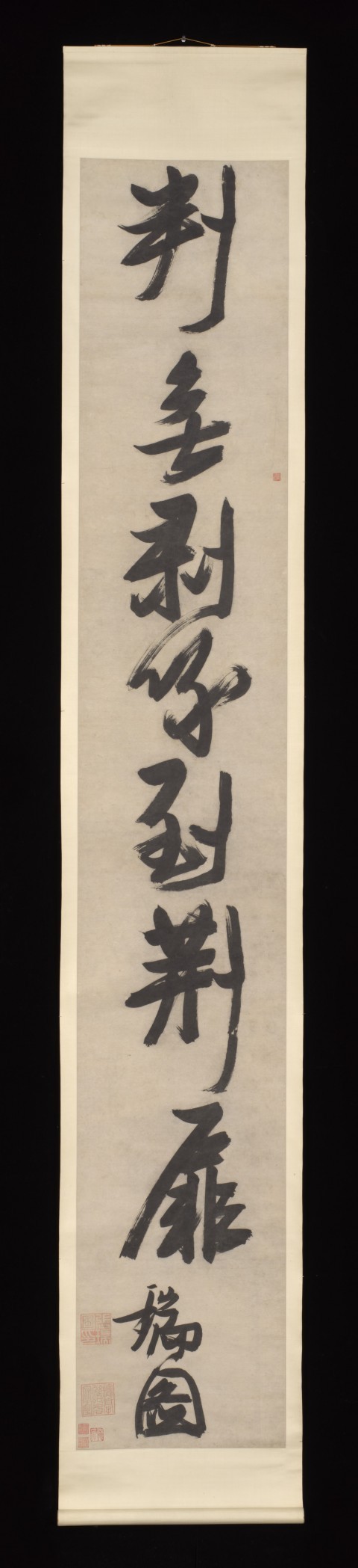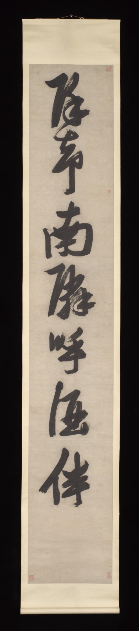 此为明代张瑞图创作的行书七言诗对联,属一对挂轴,采用纸本水墨书写。每幅图像尺寸为 281.9×45.7 厘米,整体尺寸 322.6×53.3 厘米。张瑞图(1570–1641),字长公、无画,号二水、果亭山人等,福建晋江人,明代著名书画家。该对联内容为七言律诗诗句,字体属行书风格,现藏于美国大都会博物馆。