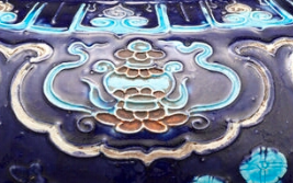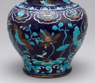 本品口径20.0 腹径34.6 底径21.9 通高47.5。此法华罐烧制于中国明代,蓝釉做底,罐身纹饰以莲花纹为核心,缀以波浪纹和白鹭纹。莲花纹中的花等部分纹饰施“白檀涂”工艺,即在素坯上贴金银箔(或涂绘泥金、泥银),其上罩以浅棕色透明釉。