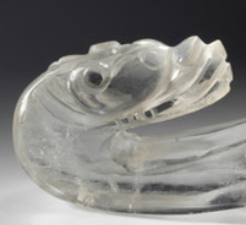 选用天然水晶, 晶体通透纯净, 极少杂质(体现高品质水晶料 )。 采用圆雕、 透雕工艺, 工匠依水晶形态巧作龙首带钩, 龙首雕琢精细, 眼、 角、 吻等细节生动, 钩身线条流畅, 利用水晶天然透明度, 呈现 “玲珑剔透” 质感, 尽显清代水晶雕刻工艺的精湛, 是水晶料与雕刻技法的完美结合 。为带钩经典造型, 龙首为钩首, 钩身为 “S” 形, 末端有钮(用于系带 ), 符合古代服饰带钩的实用功能(系束腰带 ), 同时将龙纹融入, 龙是清代皇权象征, 也寓意祥瑞, 设计兼顾实用与文化象征 。