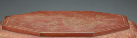 本品规格为整体20.96 x 21.59 厘米,封面6.99 x 21.59 厘米,中间部分6.03 x 21.59 厘米,黑子8.89 x 21.59 厘米。整体呈八角形,这种独特的造型在传统漆器中较为别致。八角形在中国文化中有吉祥、圆满的寓意 。漆盒由盒盖与多层盒身组成,结构精巧,方便收纳不同物品。盒身和盒盖上满布精美的花卉纹饰,可能是牡丹、莲花等具有美好寓意的花卉。金色的花纹与红色的漆地相互映衬,色彩对比鲜明, 既展现出华丽富贵的气质,也体现了古人对美好生活的向往和追求。