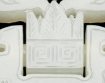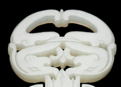 本品规格为8.9 x 5.4 厘米。整体呈锁形,这种形状在古代玉器中较为常见,寓意锁住平安、健康、福气等 。上部雕刻有类似双龙交缠的造型,富有动感和艺术感;下部主体部分雕刻有植物纹饰,从形态推测可能是桃树,桃子在中国传统文化里是长寿的象征,代表多福多寿。