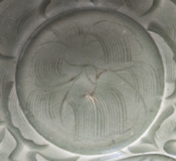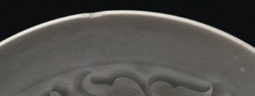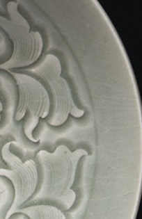 本品高6.03厘米,直径22.54厘米。整体呈浅灰色调,为圆形敞口碗型,口沿微撇,浅腹弧收,圈足。碗内壁满布雕刻纹饰,以中心为圆心,向外延展。主体是莲瓣及缠枝花卉纹,花瓣层次分明,叶脉、花瓣轮廓线流畅,如涟漪般荡漾开, 立体浮雕感强,与温润青釉相融,尽显古朴典雅。
