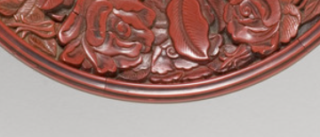 本品规格为高度2.54厘米,直径16.19厘米。整体造型为圆形盘状,边缘圆润,线条流畅,这种造型在古代漆器中较为常见,既实用,适合盛放物品或作为陈设器具,又符合传统审美中对圆润、和谐的追求 。盘面以花卉纹为主要装饰图案,雕刻有盛开的花朵以及枝叶,花朵形态逼真,枝叶舒展自然,富有生机与活力。花卉纹的布局疏密得当,展现出工匠精湛的雕刻技艺和对美的独特理解 。