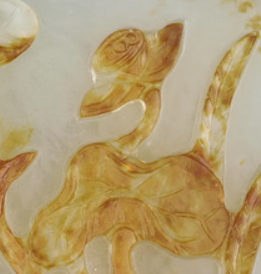 本品规格为5.72 x 7.62 x 1.91 厘米。玉质主体部分为白色,带有自然分布的黄色沁色。雕刻题材为荷塘景致,采用浮雕工艺,雕琢出莲花、荷叶等形象,造型生动,线条流畅,展现出较高的雕刻工艺水平,具有一定的艺术价值和收藏价值。