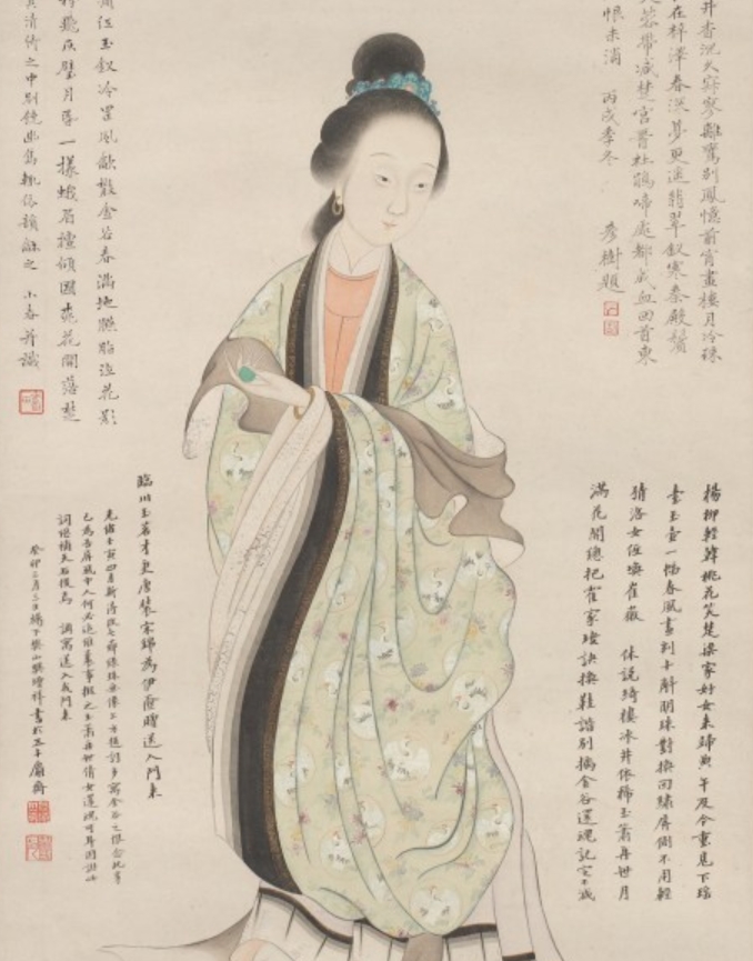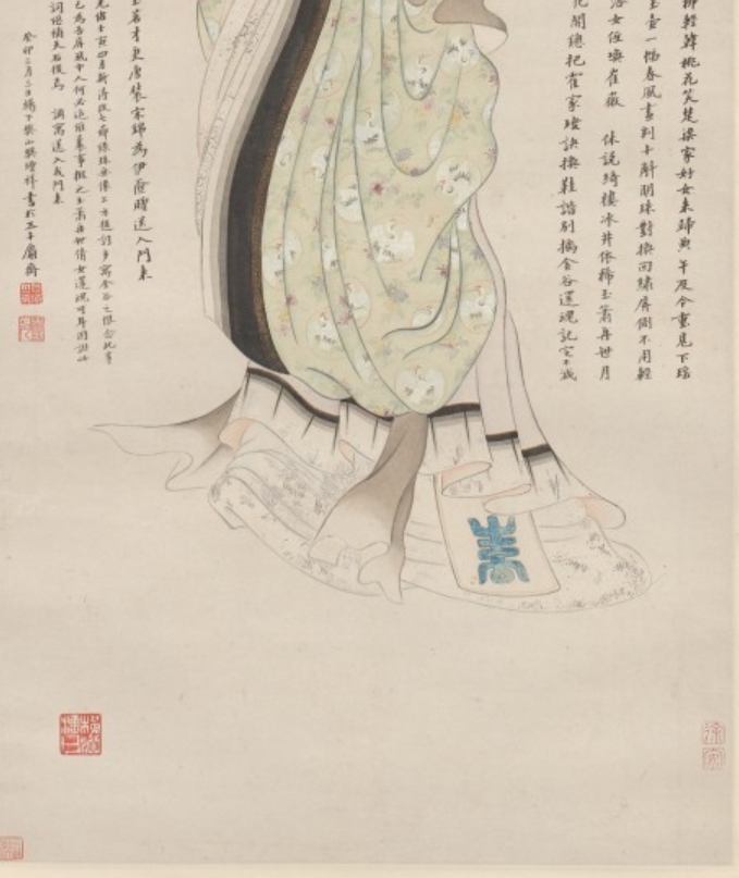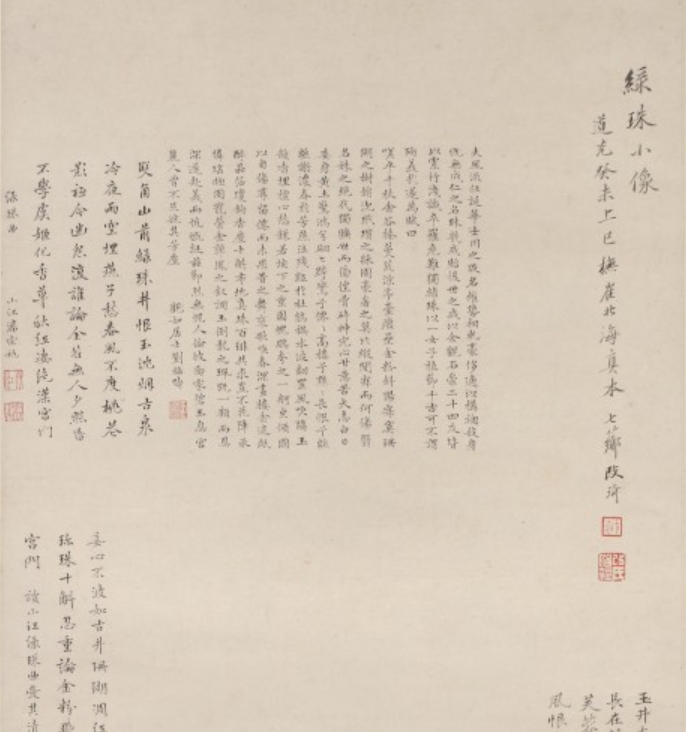 此为清代 1823 年改琦创作的《绿珠小像图》轴,属立轴,采用纸本水墨设色绘制。图像尺寸为 128.3×43.8 厘米,整体连裱 239×62 厘米,带旋钮整体 239×71.5 厘米。改琦(1773–1828),字伯韫,号香白、七芗等,回族,先世为西域人,居松江(今上海),清代著名画家。此作标题为 “绿珠小像”,落款 “道光癸未上巳橅崔北海 [子忠] 真。七芗改琦”,绘绿珠形象,现藏于美国大都会博物馆。