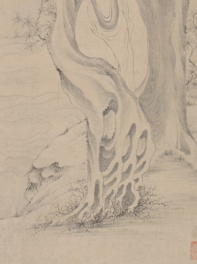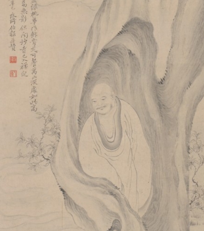 改琦是清代中后期著名画家,活跃于 18 世纪末至 19 世纪初,其家族为西域回族后裔,定居松江(今上海),擅长人物、花卉,尤精仕女与佛道题材。《罗汉图》轴绘于 1821 年(道光元年),正值清代中晚期社会相对稳定、文化艺术持续发展的阶段。罗汉题材在清代佛教艺术中仍具重要地位,既延续了唐宋以来宗教绘画的庄严性,又融入文人画家的笔墨意趣。改琦此作以 “罗汉树上打坐” 为主题,配题诗 “以云为水,因树为屋”,将禅意与自然景致结合,体现了清代文人对佛道思想的雅化诠释 —— 不重宗教神性的刻意渲染,而重 “妙香入禅定” 的空灵意境。