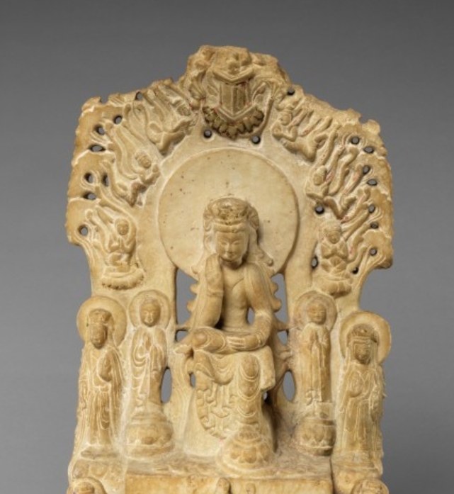 此为东魏武定二年(544 年)的石雕弥勒佛造像,属雕塑类,材质为雪花石膏,尺寸为高 55.9 厘米、宽 32.4 厘米、深 20.3 厘米,重量 29.9 千克。造像为 “弥勒佛坐像及左右菩萨像石碑” 形制,整体雕刻精细,体现了东魏时期佛教造像的典型风格,现藏于美国大都会博物馆。