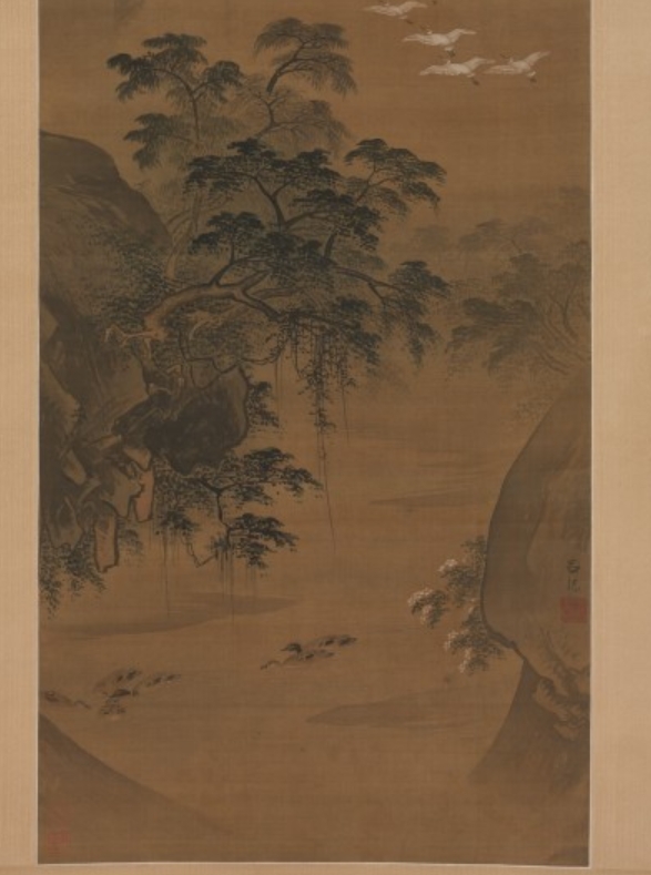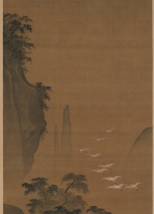 此为明代 15 世纪末吕纪创作的《秋景花鸟图》轴,属悬挂式卷轴,采用绢本水墨设色绘制。图像尺寸为 147.6×54.6 厘米,整体连裱 269.9×69.9 厘米,带旋钮整体 269.9×76.2 厘米。吕纪是明代浙江省职业画家,弘治年间(1488-1505)被召为宫廷画家,获禁卫军官荣誉头衔,其画风潇洒,延续南宋流行风格。此画以 “有白鹭和鸭子的秋季风景” 为主题,现藏于美国大都会博物馆。