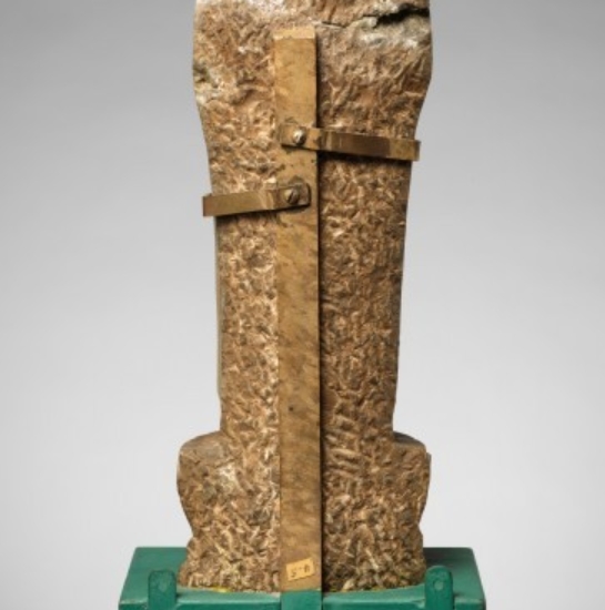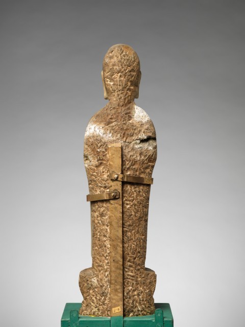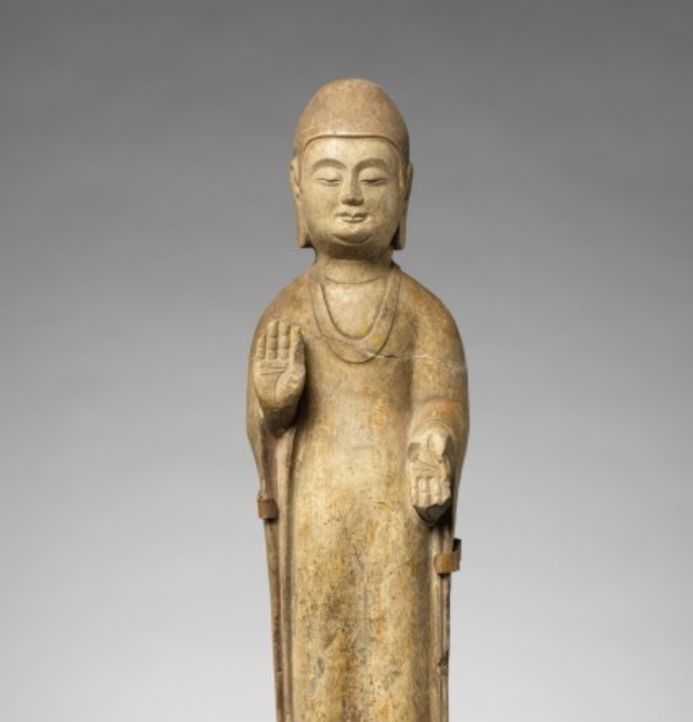 此为晚清民国时期(19 世纪末至 20 世纪初)仿北魏风格创作的石雕菩萨像一组三尊中的第三尊,属雕塑类。该组造像包含弥勒石碑、站立的菩萨、站立的佛像,其中其三为站立的佛像,材质为石头,高 52.1 厘米、宽 17.1 厘米、深 10.2 厘米,重 5.2 千克。整体延续北魏(386–534)佛教造像的典型风格,现藏于美国大都会博物馆。