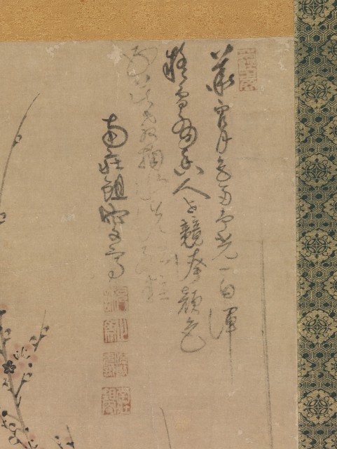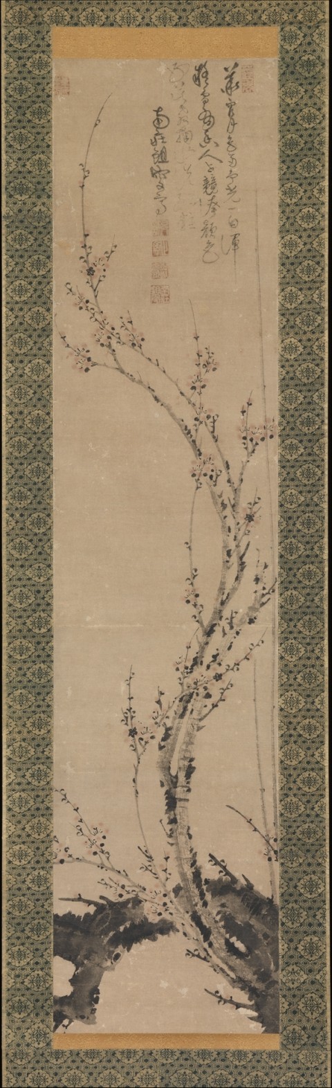 此为 14 世纪倪敬创作的《冬梅图》轴(整体),属立轴,采用纸本水墨淡彩绘制。图像尺寸为 106.5×24.8 厘米,整体连裱 192.4×35.9 厘米,带旋钮整体 192.4×40.5 厘米。倪敬(1416–1460),字汝敬,无锡人,明代官吏,活跃于 14 世纪晚期,此作现藏于美国大都会博物馆。画作以 “冬梅” 为主题,绘梅花绽放之景,紧密的淡色花朵与花蕾展现初开之态,笔墨简练却尽显梅之坚韧,延续了元代王冕画梅的笔法与意境。