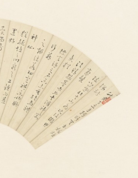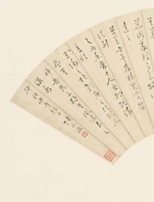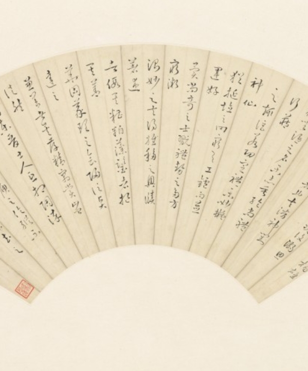 此为 20 世纪张兆镛创作的书法扇面,属折扇(裱于册页),采用纸本水墨书写,尺寸为 18.4×51.8 厘米。张兆镛(1879–1948),字访蓴、漱泉,号绍鑅、警须老人,浙江海宁硖石人,清末诸生,张宗祥侄子,清末民国时期著名书法家,与程宗伊、李叔秉并称 “硖石三书家”,擅长真、草、隶、篆各体,行楷近黄山谷,石鼓似王福厂,尤精铁线篆,亦工小学、治印,富藏书与乡邦文献,室名 “六有斋”,晚年著有《说文假借义证》(未完稿)。此扇面以 “书法” 为主题,现藏于美国大都会博物馆。
