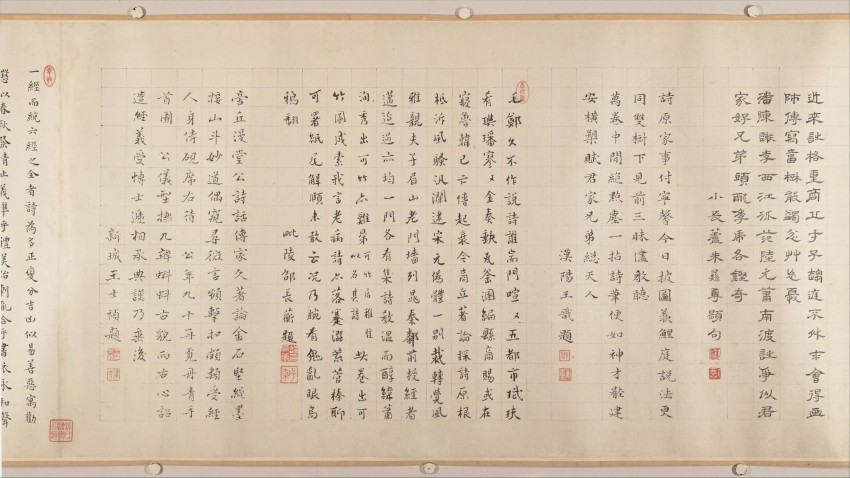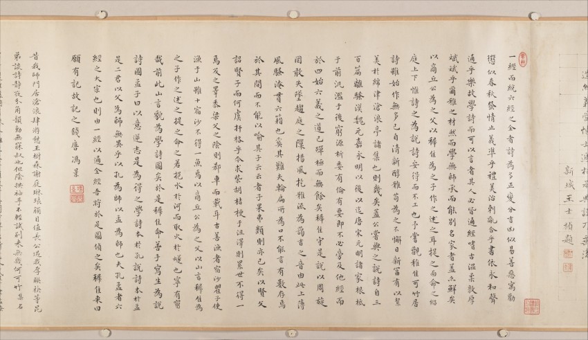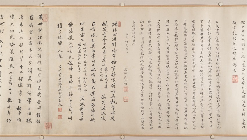 此为清代 1698 年高简创作的《宋牧仲说诗图》卷(第三部分),属手卷,以纸本水墨绘制,图像尺寸为 34.8×90 厘米。高简(1634–1707),字澹游,号旅云、一云山人,江苏苏州人,清代画家,擅长诗歌与山水画,师法元人,风格简澹清幽,布局沉稳,尤善小品与梅花书屋题材,传世作品有《春山积翠图》《江乡初夏图》等。此卷是为文人、官员宋荦(字牧仲,1634–1713)的诗论所作配图,描绘其在园林亭中研讨诗歌的场景,现藏于美国大都会博物馆。