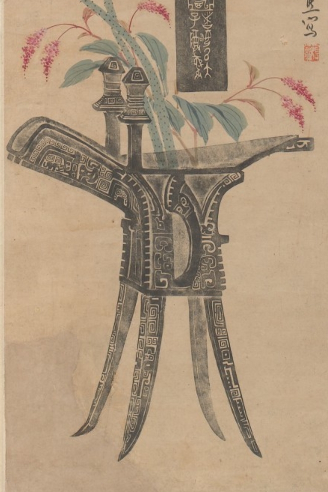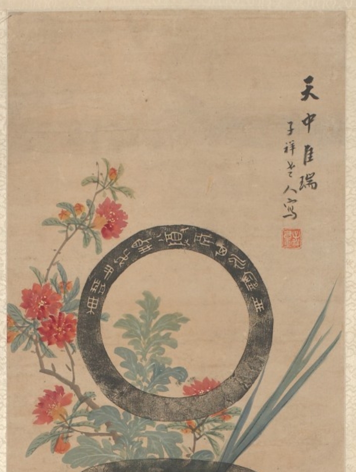 此为清代张熊创作的《天中佳瑞图》轴,属立轴,采用纸本水墨设色绘制。图像尺寸为 129.5×30 厘米,整体连裱 167.5×37 厘米。张熊(1803—1886),又名张熊祥,字寿甫(亦作寿父),号子祥,晚号祥翁,别号鸳湖外史、鸳湖老人等,室名银藤花馆,秀水(今浙江嘉兴)人,青年时移居上海,积极参与各类美术活动。此画以 “拓片与花卉” 为主题,现藏于美国大都会博物馆。