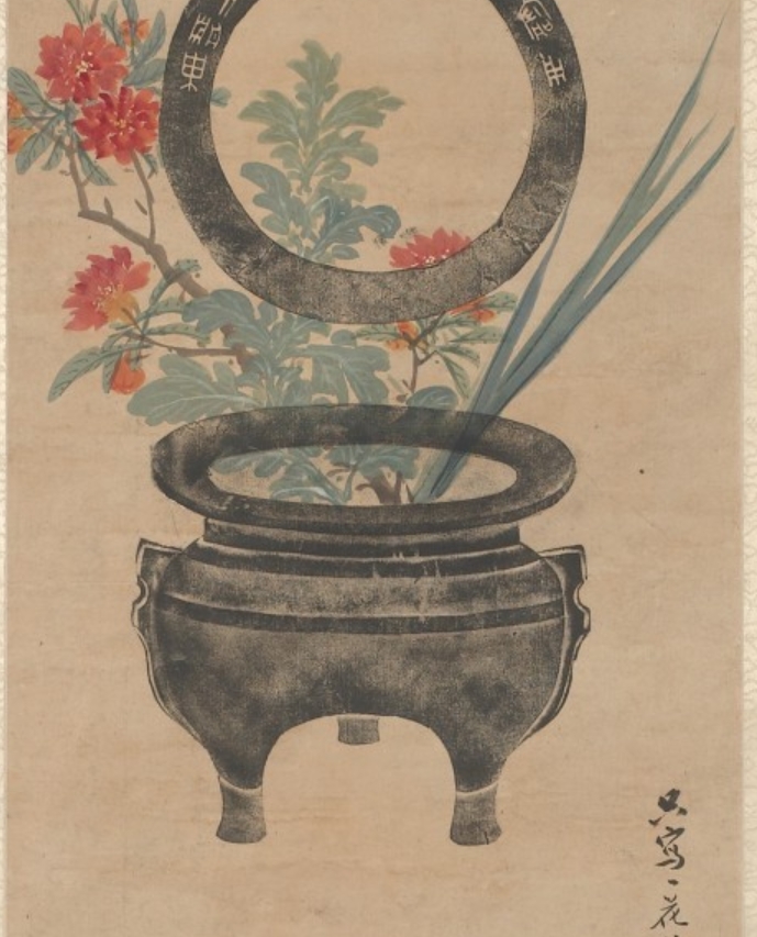 清代中后期,上海作为新兴艺术中心孕育了 “海派” 绘画,张熊是早期海派的代表人物之一,其作品融合传统笔墨与世俗审美。《天中佳瑞图》将 “拓片” 与 “花卉” 结合,既体现了文人对金石拓片的雅好,又以花卉题材贴近生活,反映了海派绘画 “雅俗共赏” 的特点,同时延续了传统花鸟画借物寓意的风尚(“佳瑞” 暗含吉祥寓意),是研究清代中后期海派花鸟画风格及文人雅趣与世俗文化交融的实物参考。