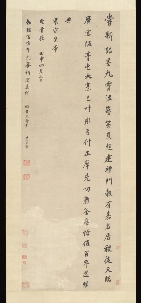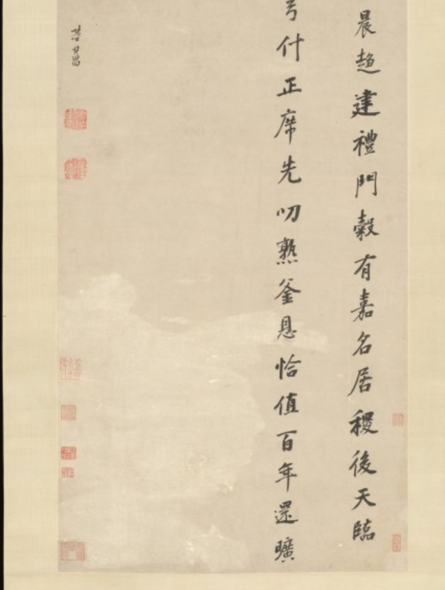 此为明代 1632 年董其昌创作的《赠筵诗》,属立轴,采用纸本水墨书写,图像尺寸为 154.6×54.6 厘米,整体连裱 268.6×71.8 厘米,带旋钮整体 268.6×81.9 厘米。董其昌(1555–1636),字玄宰,号思白、香光居士,松江华亭(今上海)人,明代大臣、书画家,“华亭画派” 代表,书法兼具 “颜骨赵姿”,存世作品丰富。此作以楷书书写七行七字诗句,主题为 “赠筵诗”,现藏于美国大都会博物馆。
