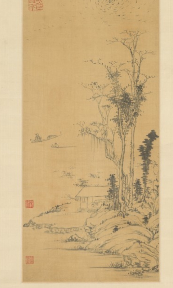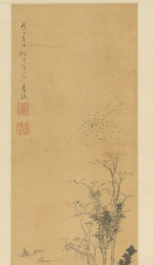 此为清代 1648 年李渔创作的《泛舟图》轴,属悬挂式卷轴,采用绸缎上的水墨画绘制。图像尺寸为 85.4×28.6 厘米,整体连裱 215.9×43.5 厘米,整体带旋钮 215.9×52.4 厘米。李渔(1611–1680?),原名仙侣,字谪凡,号天徒,后改名渔,字笠鸿,号笠翁,别号觉世稗官等,金华兰溪(今属浙江)人,生于南直隶雉皋(今江苏如皋),是明末清初文学家、戏剧家、美学家,素有 “李十郎” 之誉。此作以 “风景” 为主题,现藏于美国大都会博物馆。