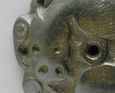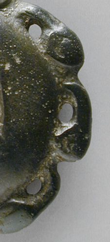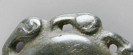 本品直径为2.5厘米。整体呈圆形,中心为半球状凸起(似模拟兽面 “额心” ),表面浅浮雕抽象兽面纹(五官简化为孔洞、线条,隐约可见 “双眼 - 鼻 - 嘴” 的对称布局 ),边缘环绕不规则云纹 / 涡纹镂空(6 组卷曲造型,似兽首、云朵 )。造型 “以简胜繁”,用几何化符号拼贴出 “兽面” 主题,体现游牧艺术 “重象征、轻写实” 的特点 —— 通过极简符号传递图腾崇拜 。