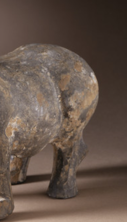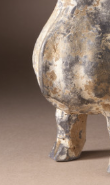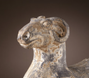 本品规格为16.51 x 7.3 x 17.15 厘米。以写实风格为主,整体呈现绵羊站立姿态。头部微微昂起,弯角盘旋,线条简洁却精准勾勒出羊的温顺神态;躯体敦实饱满,四肢粗壮稳重,比例协调,虽经岁月侵蚀,仍能感受到汉代工匠对动物形态的细致观察与概括能力 。