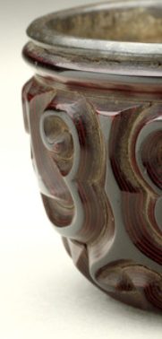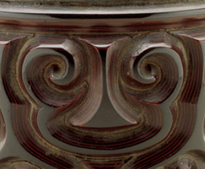 本品规格为高度3.7厘米,直径5.7厘米。杯身雕刻有类似剑柄(剑璏 )样式的云纹等图案,线条流畅,刀口断面可见相间漆层,纹理优美且富有层次感,展现出传统漆器雕刻艺术的精湛 。 其凭借独特工艺与美观造型,成为剔犀漆器中的经典器物,见证古代漆艺的高超水平。